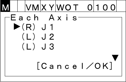 上下カーソルキーで 任意の軸にカーソルをあわせ[OK]を押すと、[ブレーキの解除/ロックの切替え画面] を表示します。