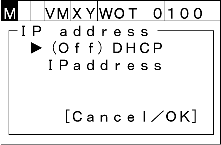 上下カーソルキーで、[IP address]を選択し[OK]を押すと、次のような [IPアドレスの設定画面] が表示されます。