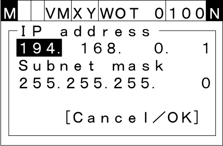 上下カーソルキーで、[IP address] を選択し[OK]を押すと、次のような [IPアドレスの数値入力画面] が表示されます。