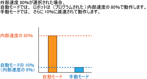 - 自動モードでは実際のロボットは[内部速度×外部速度(%)]で動作します。たとえば外部速度に80%を設定すると、内部速度×80%でロボットは動作します。