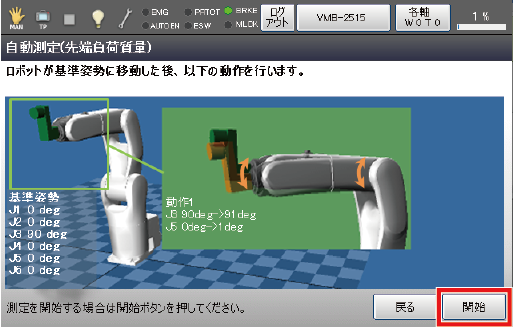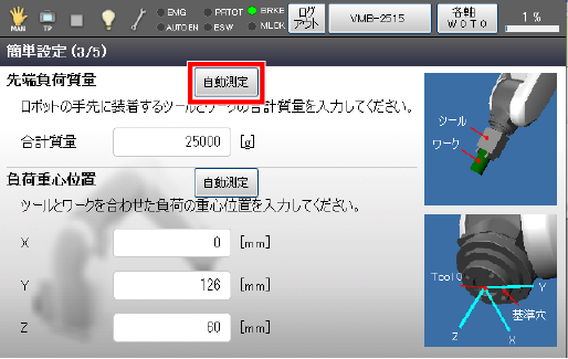 負荷推定機能とは、ロボットに特定の動作を行わせることで、先端負荷の質量と重心、重心イナーシャを推定する機能です。この機能は簡単設定の "先端負荷質量" と "先端負荷重心" および "負荷重心イナーシャ" の入力時に使用することができます。