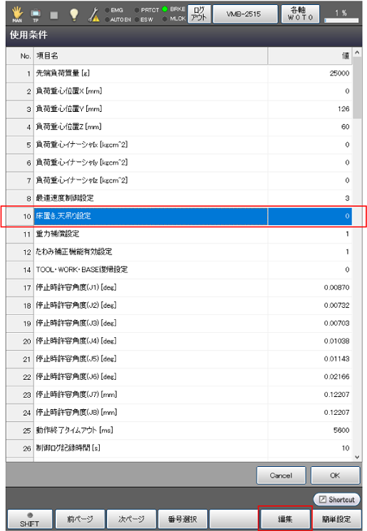 [床置き、天吊り設定]を選択し、[編集]を押します。