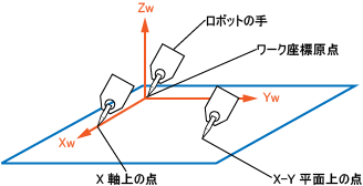 図に示すように、ワーク座標の原点とX軸上の点、X-Y平面上の点の3点を教示してワーク座標を設定する方法です。