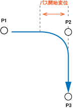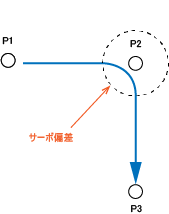 現在位置P1より、点P2を通り、点P3へ移動するプログラムの例を4種類示します。それぞれ、パス動作、エンド動作、エンコーダ値確認動作のプログラム例です。