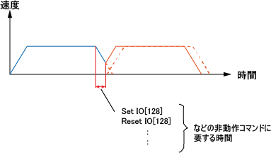 下図に、パス動作コマンドと次の動作コマンドとの間に、非動作コマンドがある例を示します。この例のような場合、下図に示すように、パス動作コマンドの減速時間中に非動作コマンドを実行するため、パス動作の実行時間短縮効果が小さくなります。