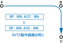 ロボットが自動的に設定した加速度を使用し、パス動作を行なう場合、動作経路は常に一定です。下図に、速度を60%と80%に設定した例を示します。