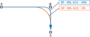 任意に加速度を設定すると、動作経路が変化します。下図では、速度60%の設定に対し、加速度と減速度の両方を100%にした場合と、10%にした場合を示します。