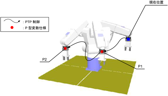 現在位置からP1、P2へPTP制御にて順次アームを動作させます。