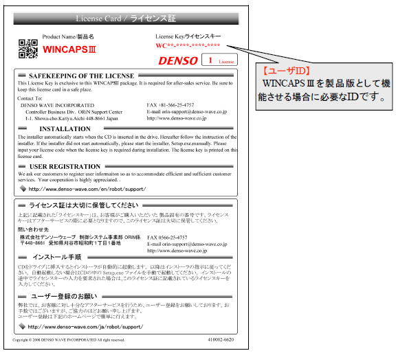 製品版WINCAPSIIIには、ライセンス証が同梱されます。Light 版およびTrial版のライセンスはCDのレーベル面に印字されています。