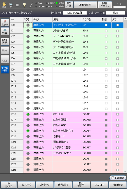 専用入出力、汎用入出力、内部I/Oの状態を、リアルタイムで監視することや、汎用出力・HAND出力・内部I/O信号の強制出力や、汎用入力・HAND入力信号を擬似的にI/O入力し、ロボット動作のシミュレートを行うことが出来ます。