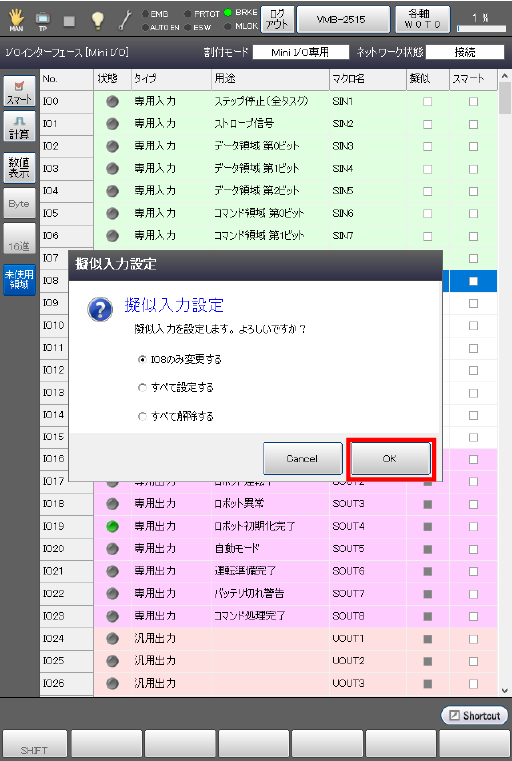 [F4 擬似スマート]を押すと、[擬似入力設定]ウィンドウが表示されるので、[IO8のみ変更する]を選択し、[OK]を押します。