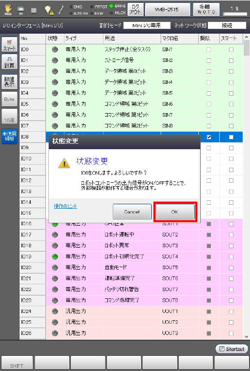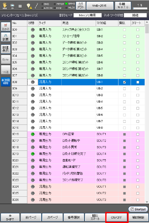 I/OのON/OFF操作を行うと、ロボットの出力信号がON/OFFします。