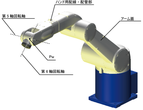腕・ひじ・手首の境界の判定は、第5軸の回転軸と第6軸の回転軸が交わる点「Pw」の位置を使って行います。