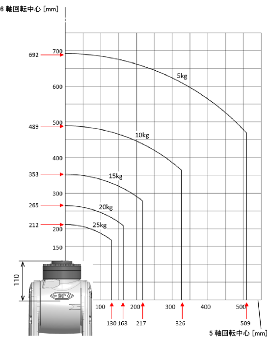 下図は、ロボットの6軸および5軸の回転中心から、フランジにかかる総負荷の重心位置までの距離が、どこまでだと許容値内に収まるかということを、質量別に表したものです。