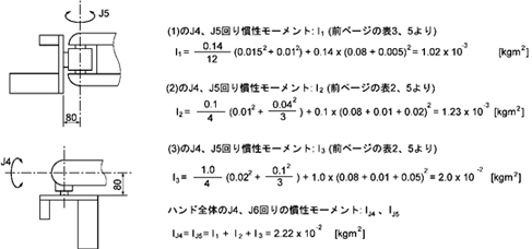 フランジにかかる総負荷が、4軸、5軸、6軸回りに加える慣性モーメントを求めるときには、下記の計算式を参考にしてください。
