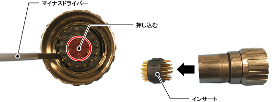 インサートのラッチをマイナスドライバーで押し込み、取り外します。両側のラッチ2か所を外したらインサートを取り外します。