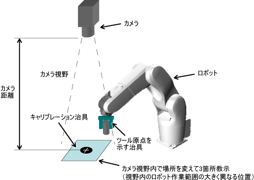 視覚座標を読取った治具は動かさずにロボットを移動し、マークの重心位置にロボットのツール原点を合わせ、ロボット座標を読取り登録します。