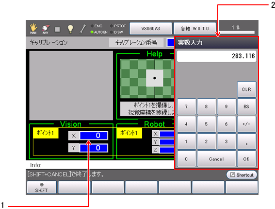 1の座標部分をタッチすると2の数値入力画面が表示されます。視覚装置で読取った視覚座標(X、Y)を入力し、[OK]ボタンを押します。