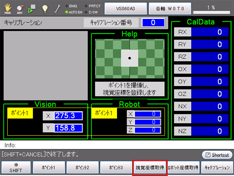 カメラでポイント1を撮像し、座標を読取ります。読取った座標を次の手順で入力します。
