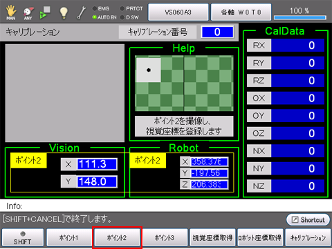 [ポイント2]のボタンを押すと2箇所目の視覚座標、ロボット座標が登録可能になります。
