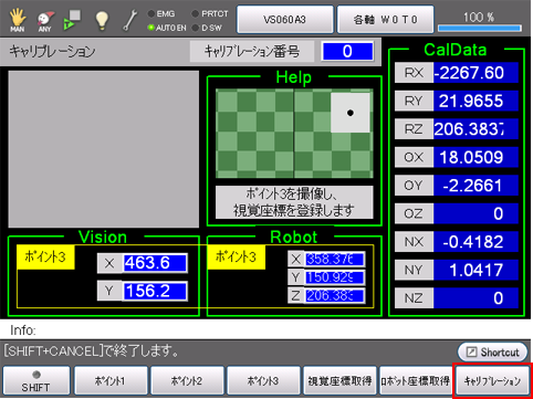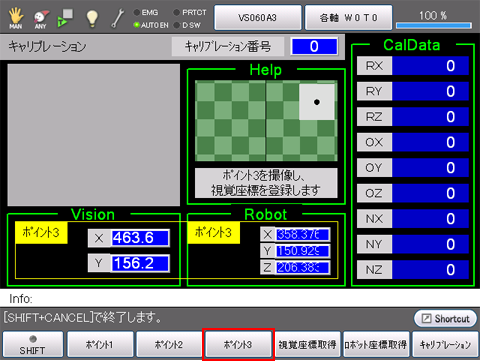 [ポイント3]のボタンを押すと3箇所目の視覚座標、ロボット座標が登録可能になります。