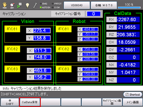 キャリブレーション結果を保存するために、結果画面へ切替え、[CalData保存]ボタンを押します。