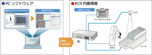 | EVP2 | EVP2は、ロボットが視覚による位置補正を行うための画像処理を、プログラムレスで設定できるソフトウェアです。 コントローラに接続されたカメラを用いて画像を処理します。画像処理の設定は、PCのアプリケーションであるEVP2ガイダンスを使用し、画像処理実行時には、コントローラとコントローラに接続されたカメラのみで実施します。 視覚によるロボットの位置補正を行うためには、カメラとロボット間のキャリブレーションが必要です。EVP2ではキャリブレーションウィザードで、このキャリブレーションを実施します。 さらに、EVP2は、視野内のワーク配置状態を出力する機能も備えており、フィーダなどのお客様手配の機器によるワークの移動を制御することができます。