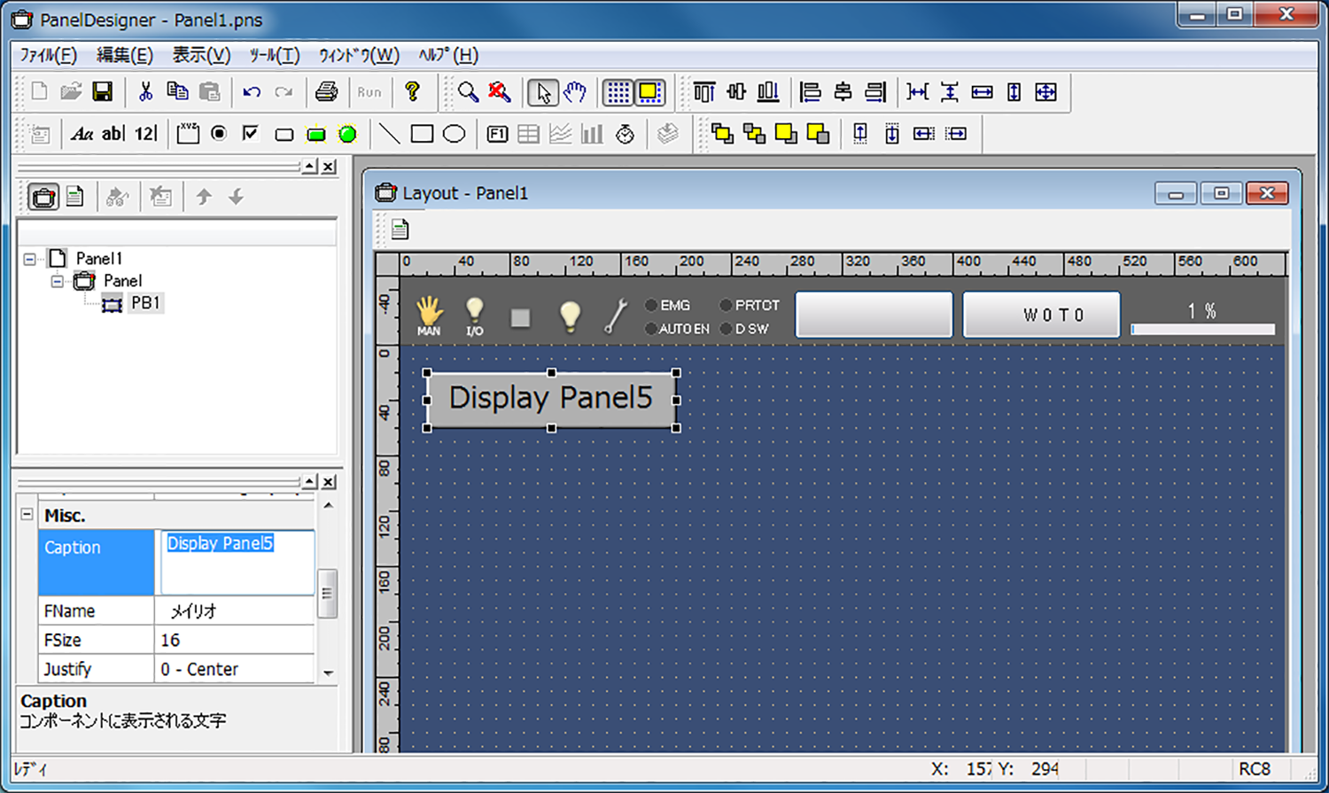 操作盤切替えをするためのボタンを作成します。ここではPanel5という操作盤ファイル(Panel5.pns)を表示するボタンの作成を例とします。ボタンのCaptionはわかりやすい名称にしましょう。