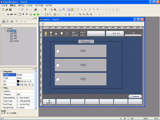 ラジオボタン3個で排他処理を行う例を示します。PanelDesignerでラジオボタン3個とグループ1個を配置します。