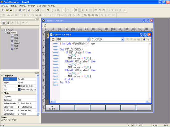 ここでは同一画面上のボタンが押されたときに,ラジオボタンの状態(ON/OFF)をIO[24]~IO[26]に出力し,RB1が選択されていたらF[10]の値を,RB2が選択されていたらF[11]の値を,RB3が選択されていたらF[12]の値を同一画面上の数値入力ボックスに格納する例を記述します。