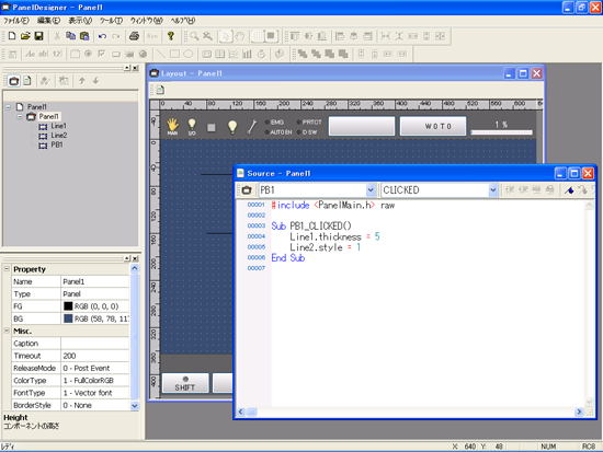 ボタンと同様にPanelDesignerを起動し、画面に直線を描画します。