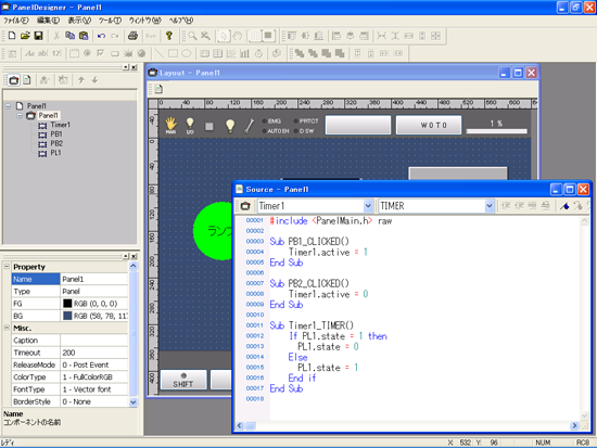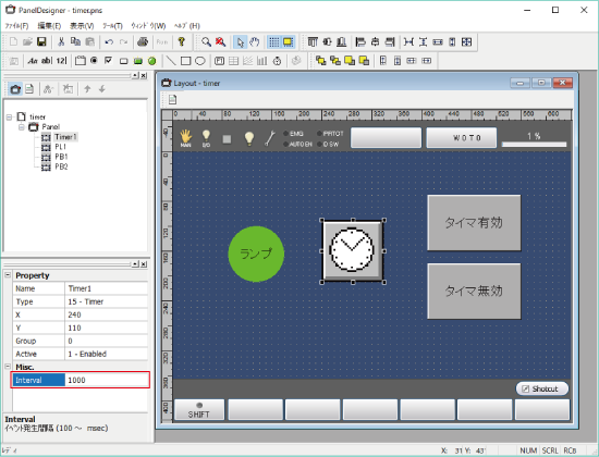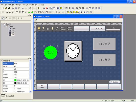 まず、PanelDesignerで部品(タイマ、ボタン2個、ランプ)を配置します。