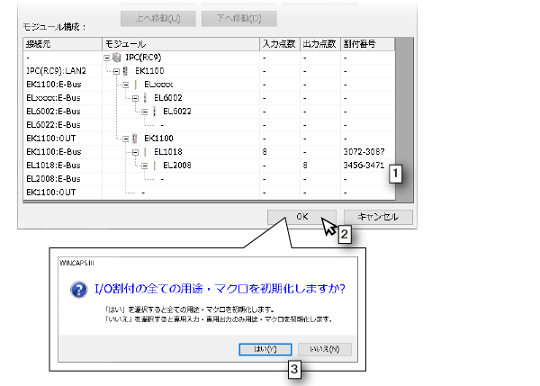 - I/O割付の初期化をするかどうか選択するウィンドウが表示されるので、「はい」か「いいえ」のどちらかをクリックします。