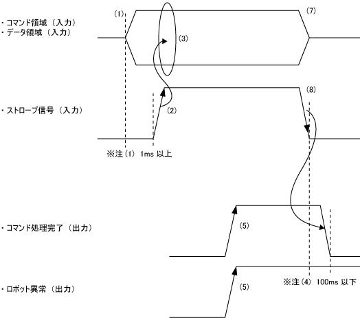 - コントローラは、ストローブ信号のON→OFFの立ち下がりで、コマンド処理完了出力を、OFF状態にします。コマンド処理エラーに伴い出力されるロボット異常は、ロボット異常クリアコマンドが実行されるまでON状態を保持します。