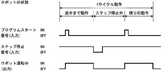 - この信号がON(短絡)→OFF(開放)されると、ロボットは現在実行中のステップを終了した時点で、全タスクを停止し、ロボット運転中出力をOFFします。しかし自動モード、外部モード出力ONは維持されており、プログラム操作コマンド(起動)の入力でプログラムの続きを実行します。下図をご参照ください。