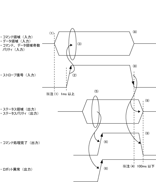 ストローブ信号によるコマンド入力は専用出力「ロボット初期化完了」が出力されるのを待ってから行なってください。ただし、エラー発生時にロボット異常クリアを実行する場合は、ロボット初期化完了は出力されないので、そのまま実行してください。