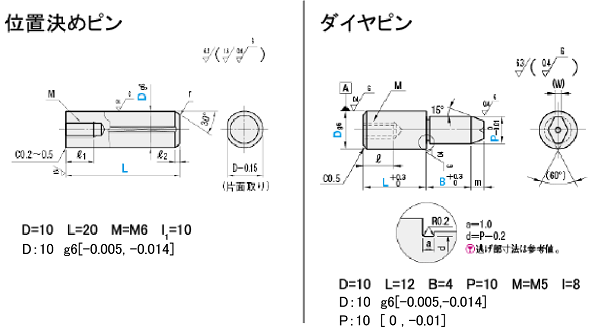 位置決めピンとダイヤピンはロボットに同梱されています。各ピンの寸法は下図のとおりです。