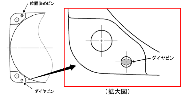 ダイヤピンを使用する際は、ダイヤピンの向きに注意してください。下図のように、ダイヤピンの山が位置決めピンの方を向くようにしてください。