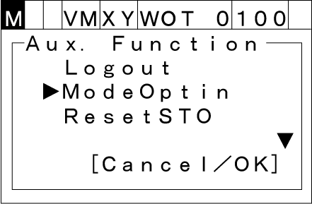 [AUX]キーを押して、次のような [補助機能選択画面] を表示します。上下カーソルキーで[ModeOptin]を選択します。