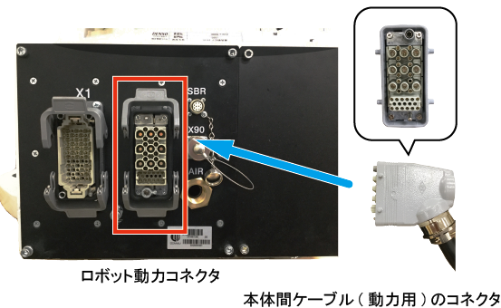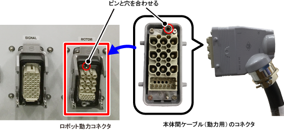 本体間ケーブル(動力用)のコネクタとロボット動力コネクタの左右の向きを合わせます。