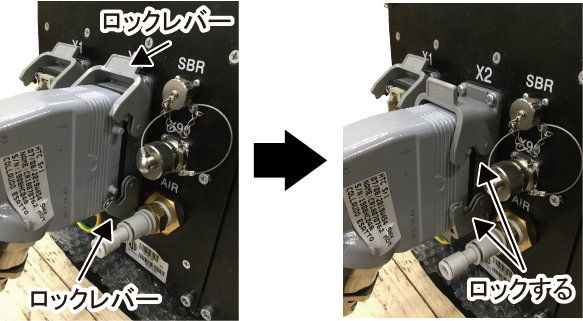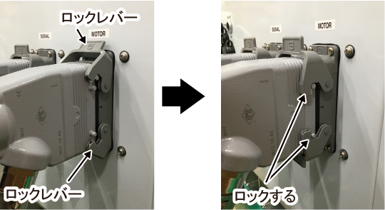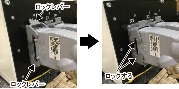 本体間ケーブル(動力用)のコネクタをロボット動力コネクタにまっすぐ挿入し、2つのロックレバーを動かしてロックします。