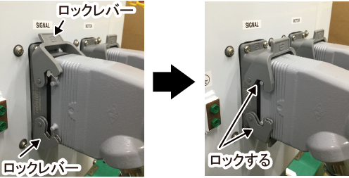 本体間ケーブル(エンコーダ用)のコネクタをロボットエンコーダコネクタにまっすぐ挿入し、2つのロックレバーを動かしてロックします。