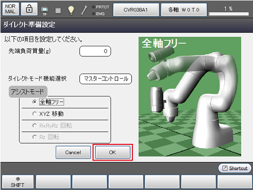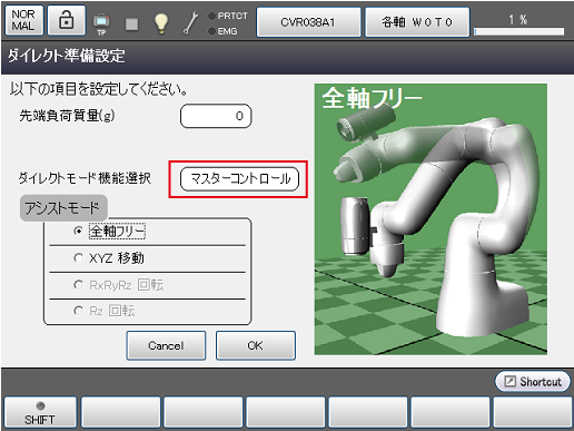 ダイレクト準備設定の画面で、[ダイレクトモード機能選択]を 選択し、"マスターコントロール" に変更します。