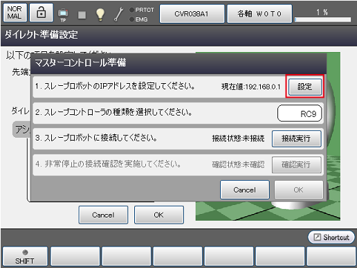1の[設定]を押し、スレーブロボットのIPアドレス を入力します。