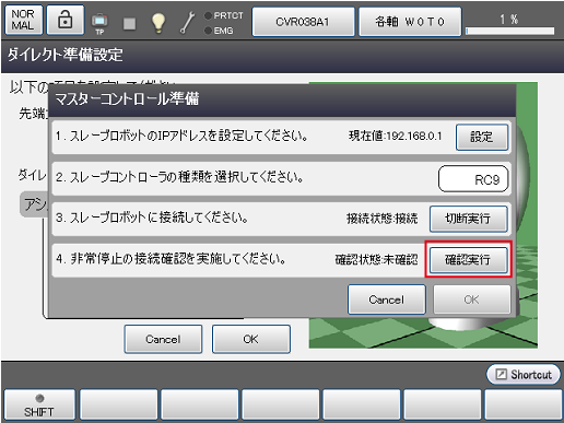 4の[接続実行]を押し、非常停止の接続状態を確認します。