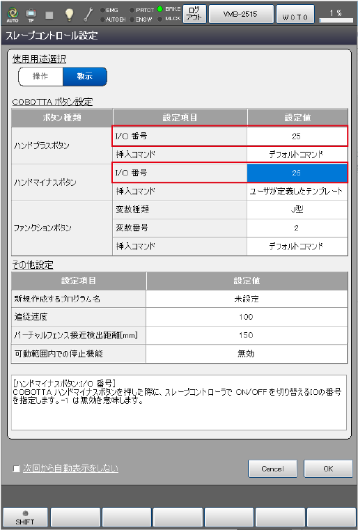 COBOTTAのアーム上のハンドプラス/マイナスボタンにスレーブロボットのI/Oを割り当てて、ON/OFFを切り替える機能です。