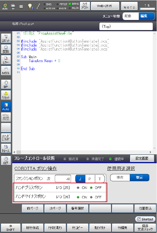スマートTPの画面下部にスレーブコントロール状態が表示されていますので、設定したI/O状態の確認にご利用ください。