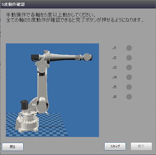 どの軸が動作確認を完了したか確認する画面が、表示されます。この画面を表示しているとき、手動操作でロボットの各軸を動かします。