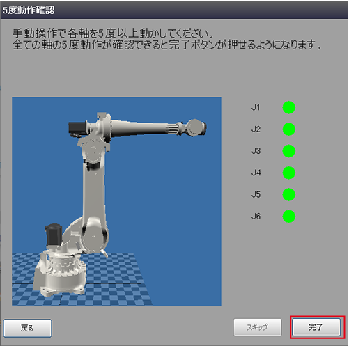 すべての軸の動作確認が完了すると、画面の[完了]ボタンが有効になります。