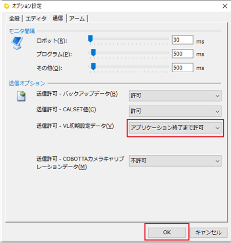 開いた[オプション設定]画面で、[通信]タブの [VL初期設定データ] を "アプリケーション終了まで許可" にして、[OK]をクリックします。
